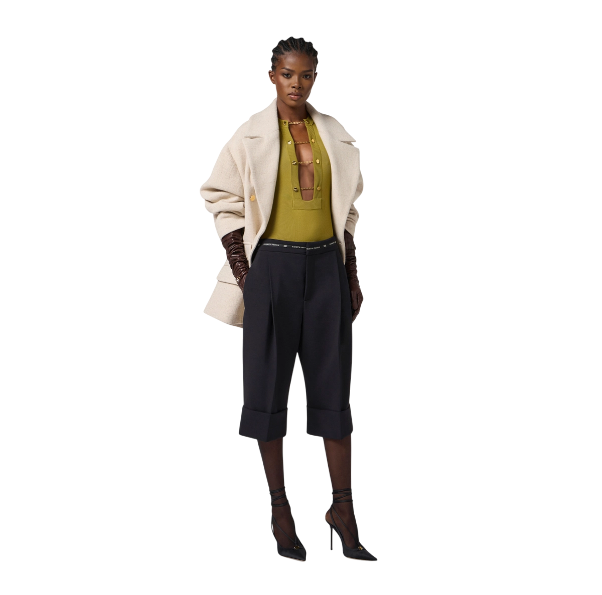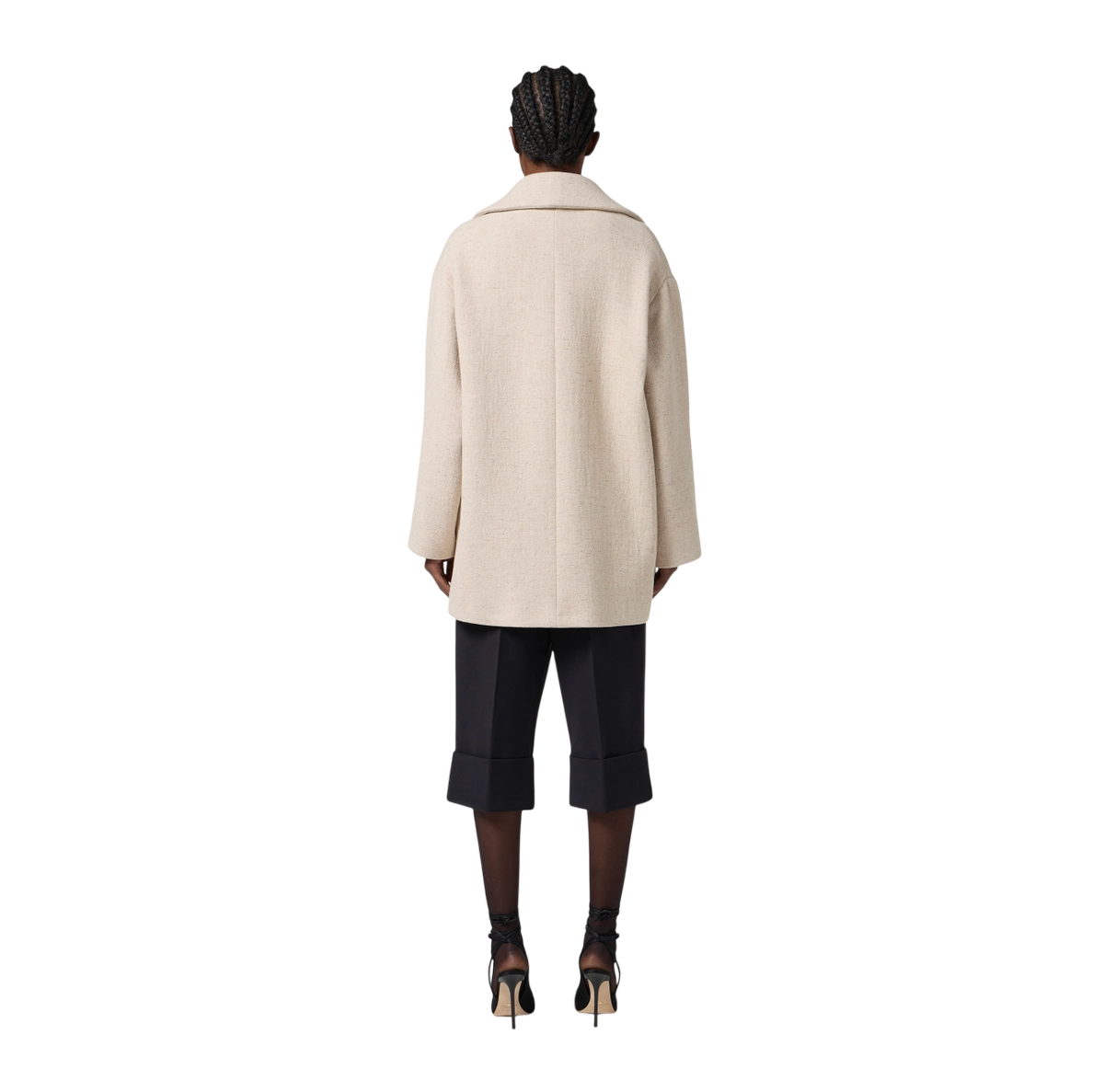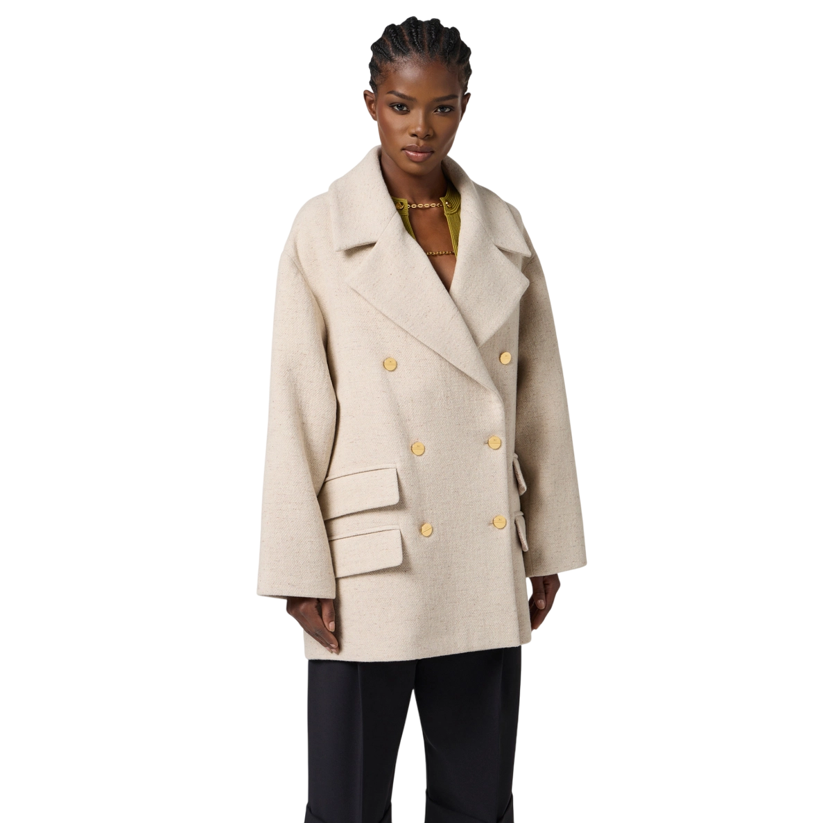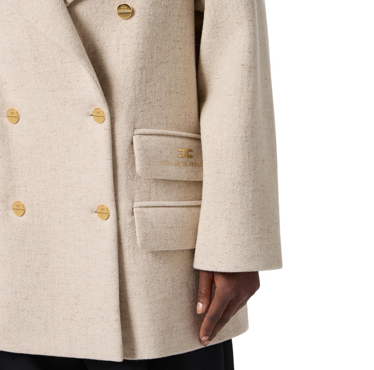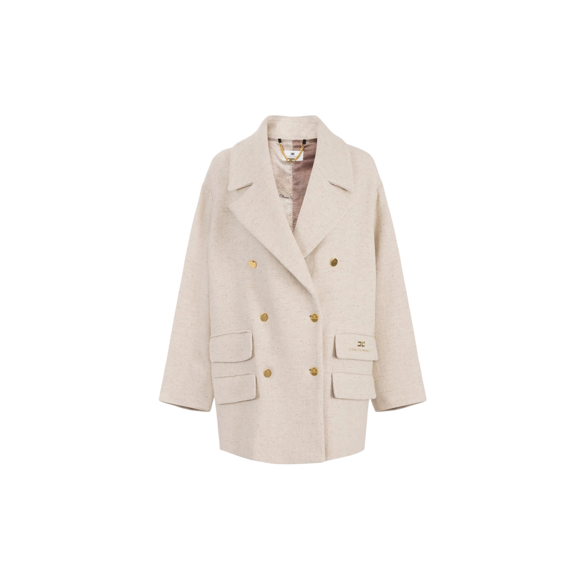 Cappotto caban in panno di lana dalla vestibilità over. Con ampio rever, spalle scese e chiusura doppiopetto, ha dettagli preziosi come i bottoni in metallo dorato e la stampa luminosa con logo a rilievo su una delle quattro patte.