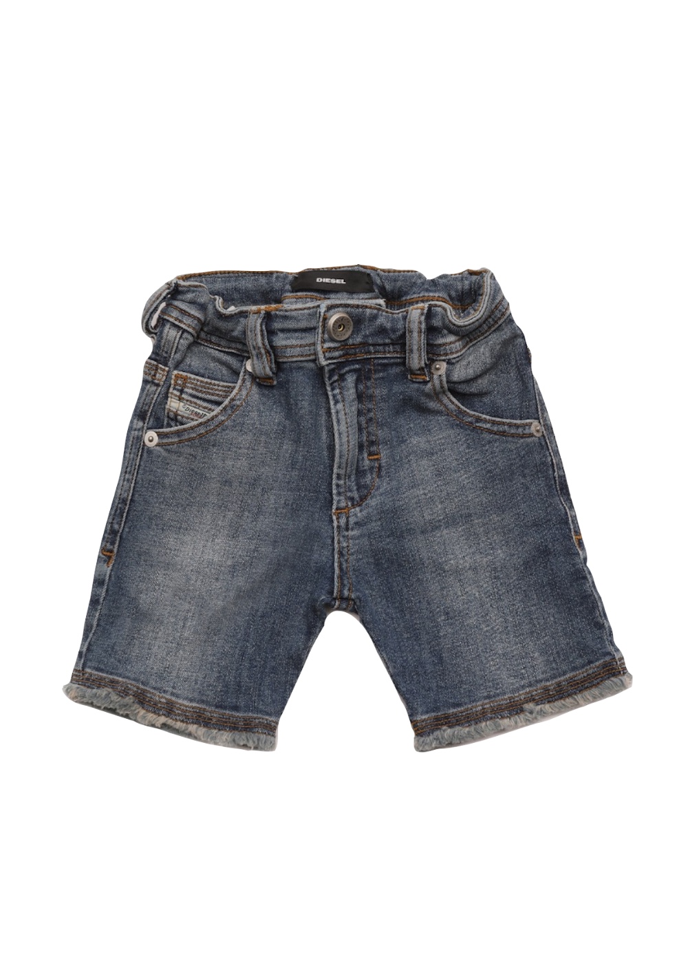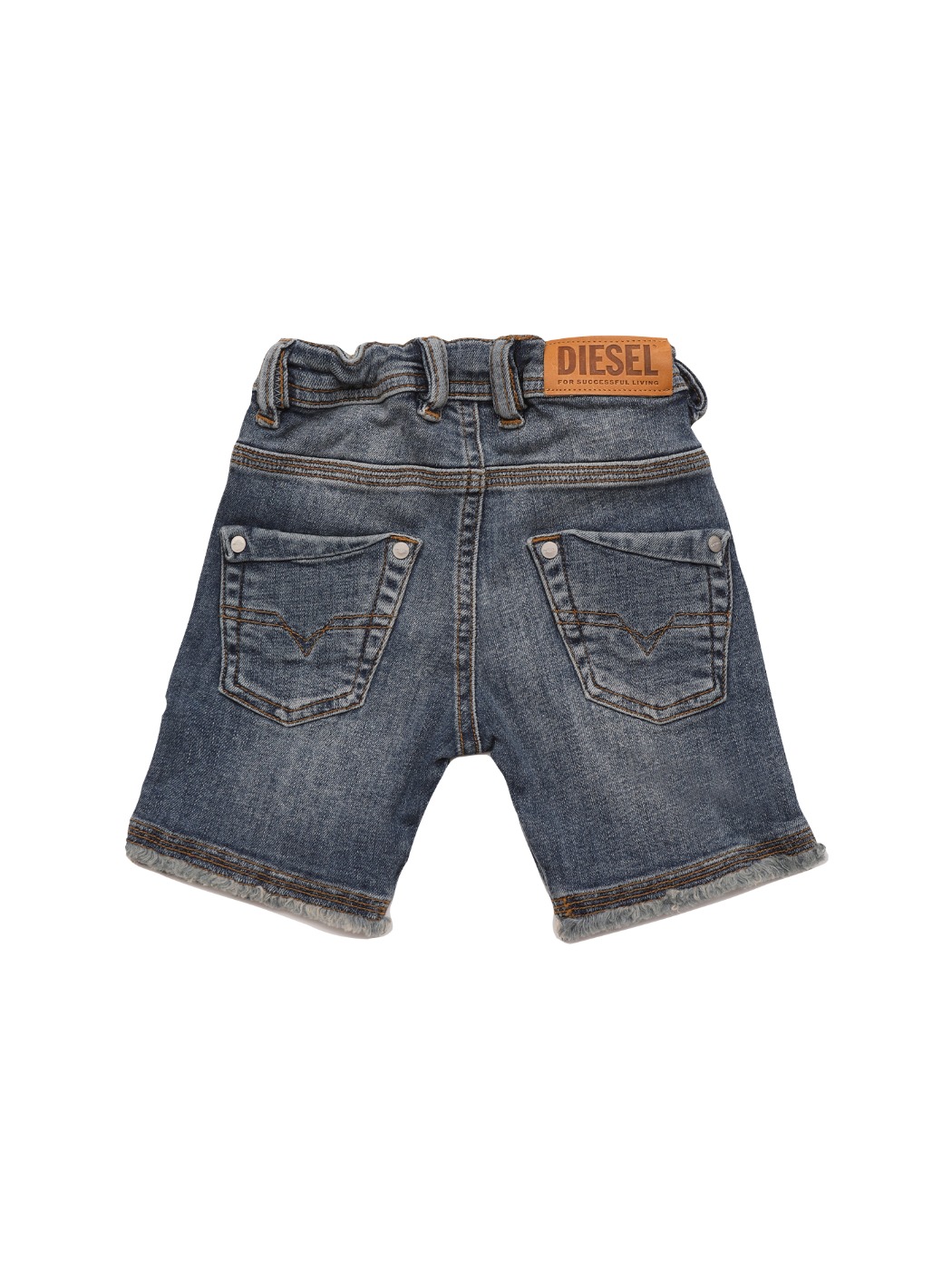 Shorts dalla vestibilità regular, realizzati in denim super stretch blu medio e caratterizzati da un’applicazione in pelle beige in vita sul retro.