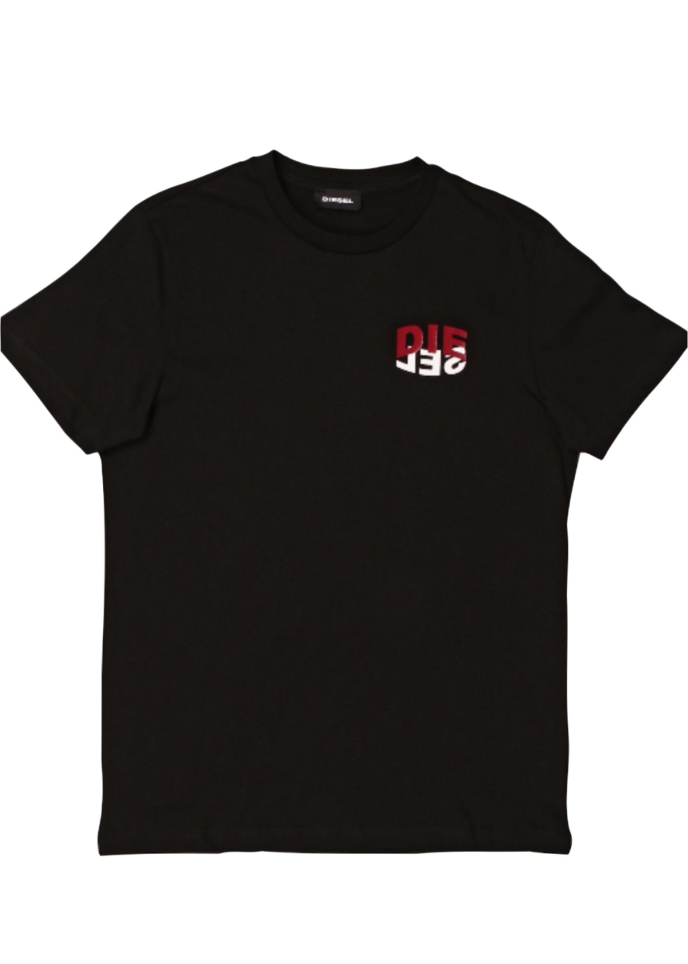 T-shirt in jersey di cotone. Il capo è completamente nero, con la scritta “diesel” in bianco e rosso sulla parte sinistra del torace.