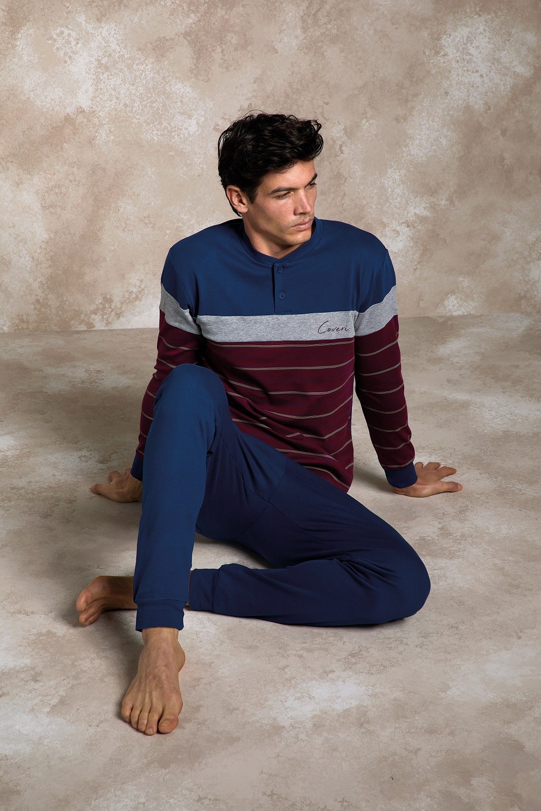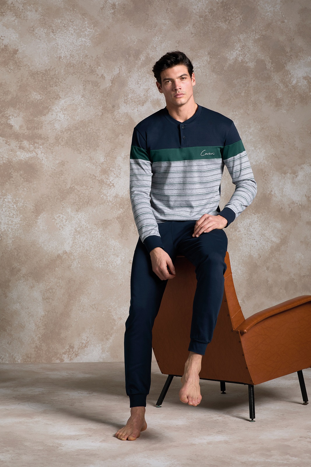 Scopri il pigiama uomo Enrico Coveri, perfetto per le stagioni più fredde grazie al suo caldo cotone morbido e traspirante. La maglia presenta un moderno design a righe, con dettagli a contrasto e logo ricamato sul petto. Il pantalone, in tinta unita, ha una vestibilità comoda e pratica grazie all’elastico in vita e ai polsini che garantiscono una perfetta aderenza.