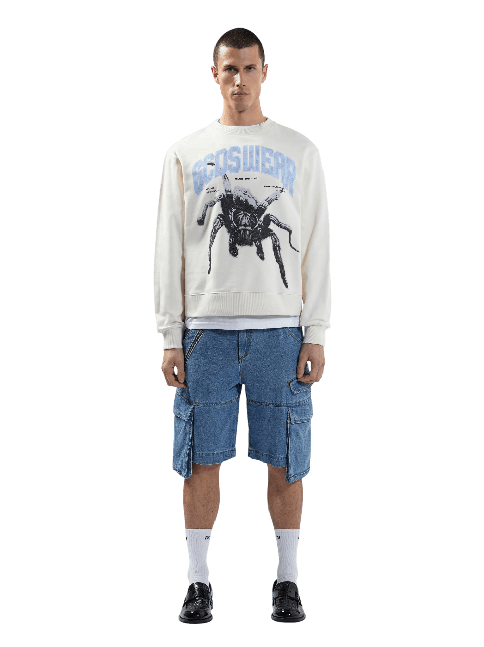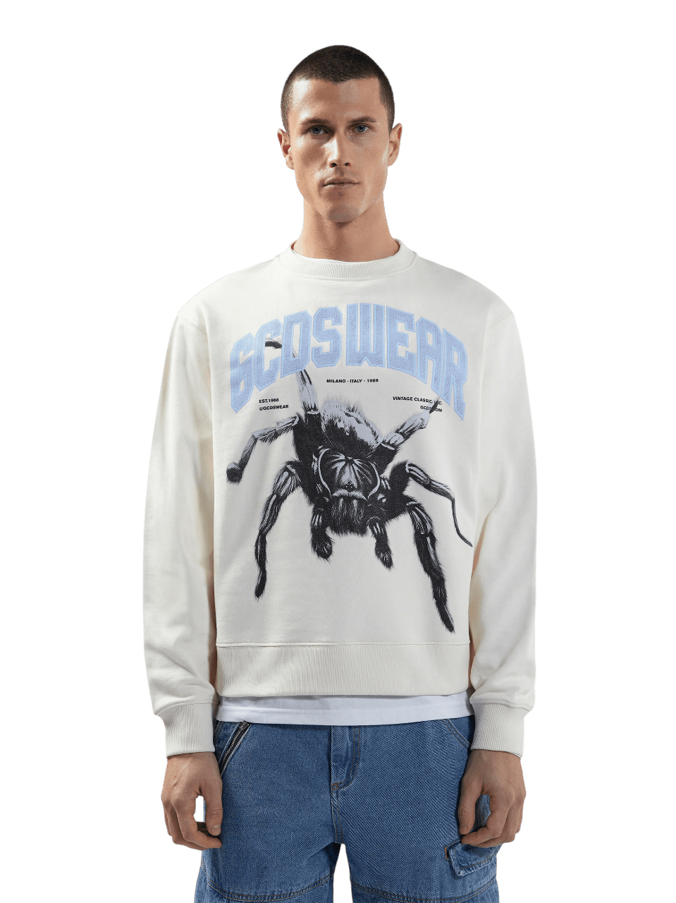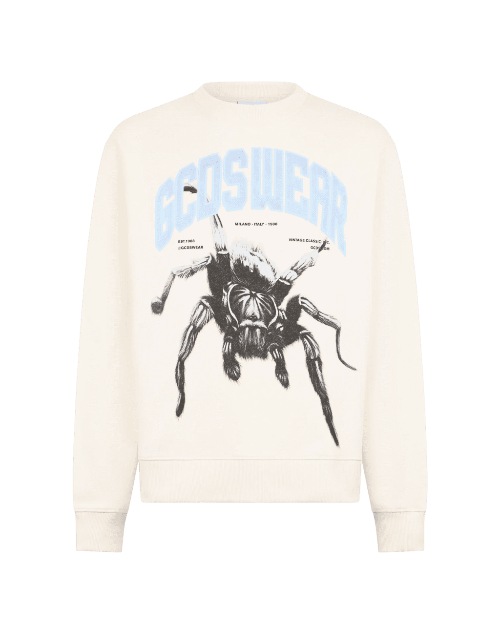 Felpa girocollo color bone con logo “GCDS WEAR” stampato e grafica spider sul davanti. FIt regular.
