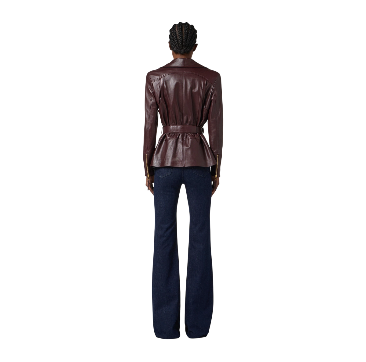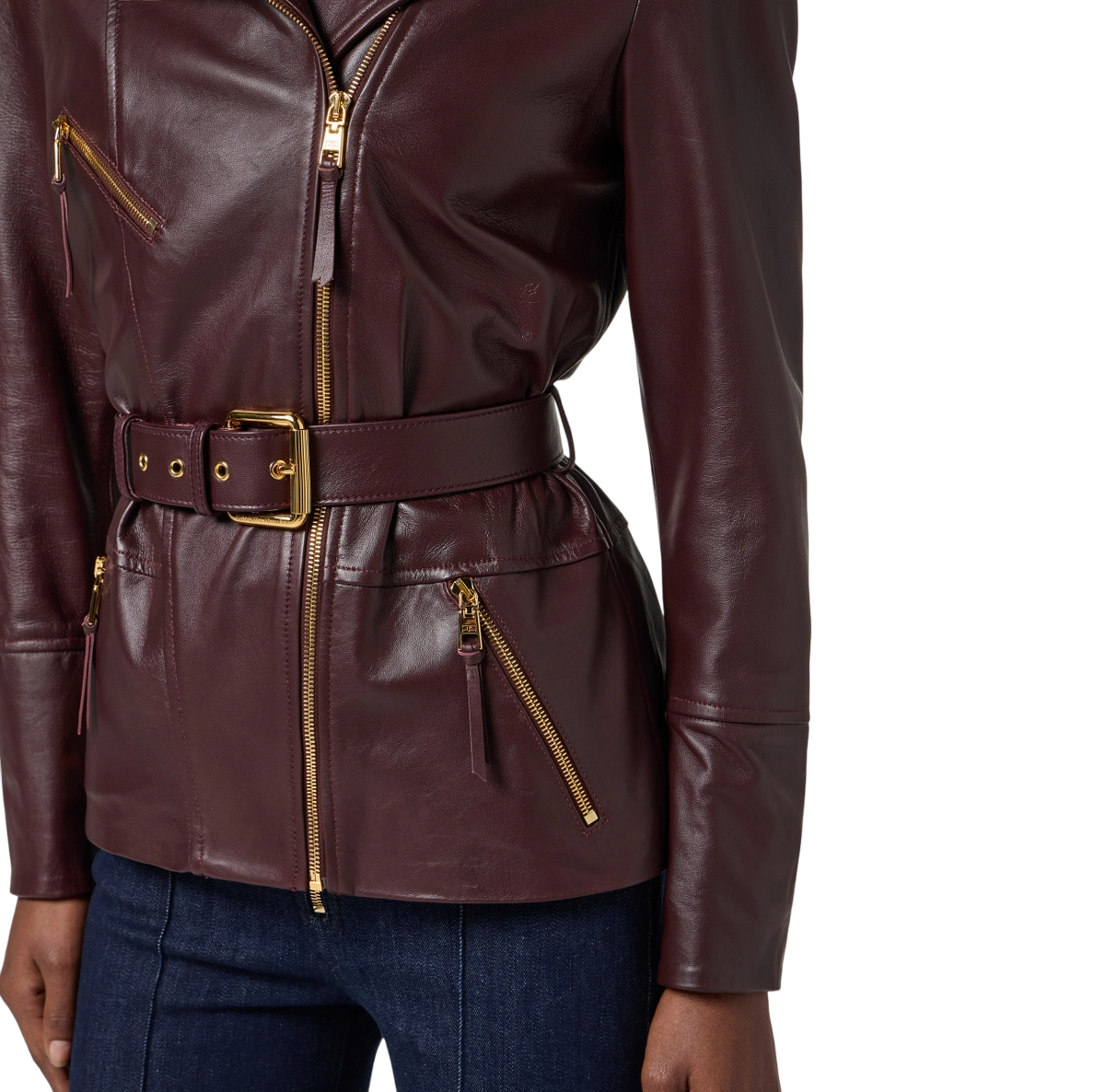 Chiodo in pelle. La giacca richiama i classici modelli biker con rever, tasche e chiusura asimmetrica con zip. Reinterpretata per l’eleganza contemporanea con spalle strutturate, cintura con fibbia che esalta il punto vita e passante con logo sul retro a creare un effetto di arricciatura.