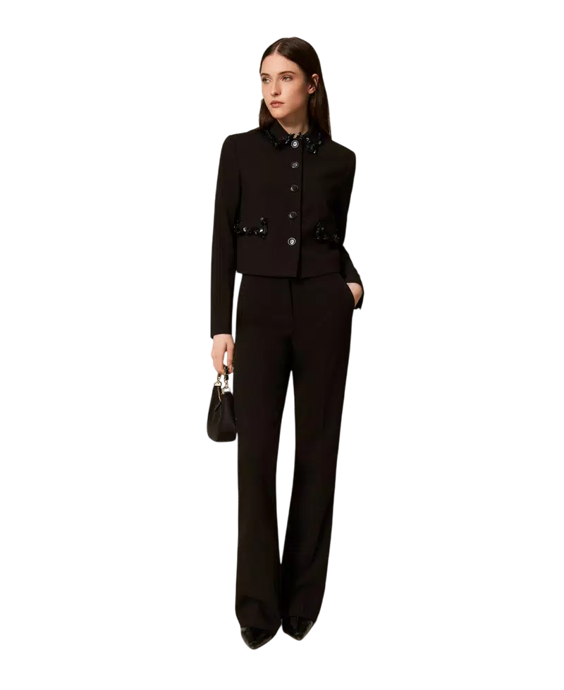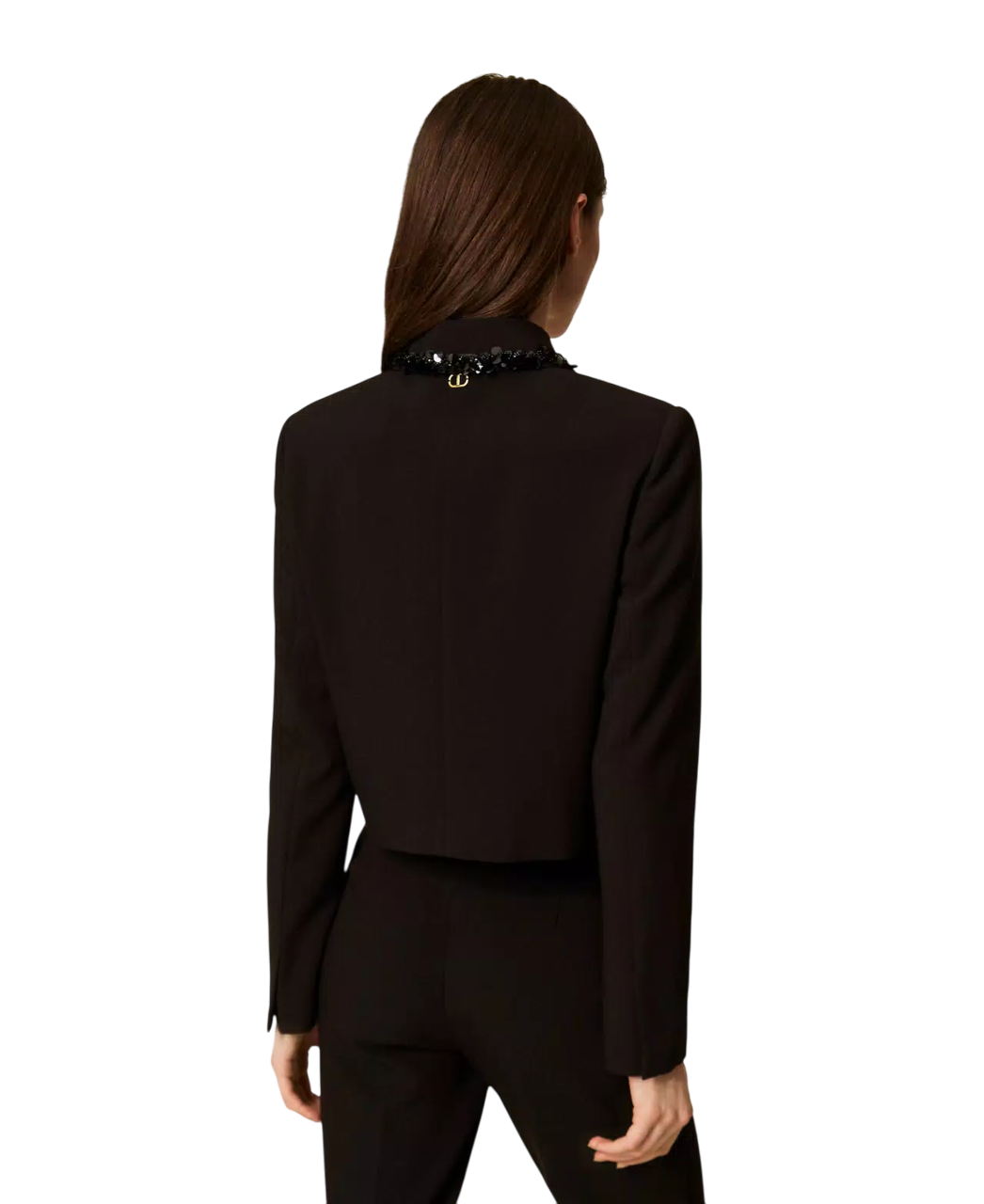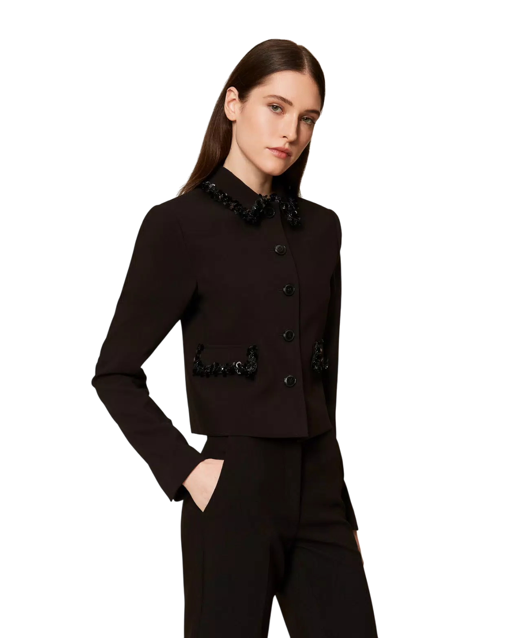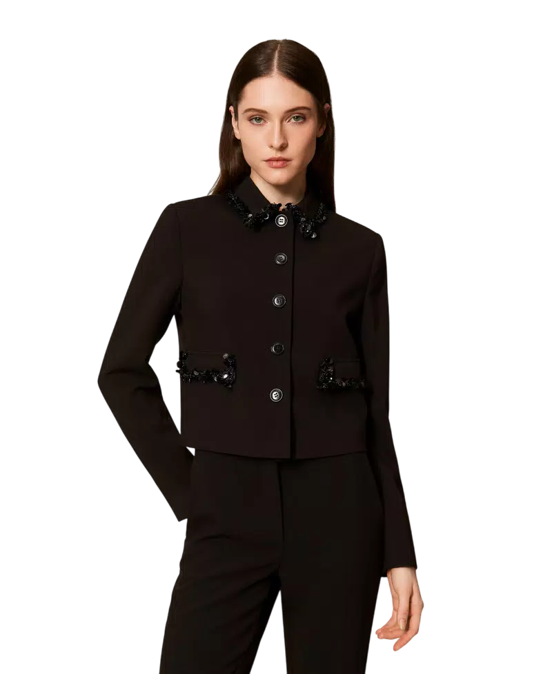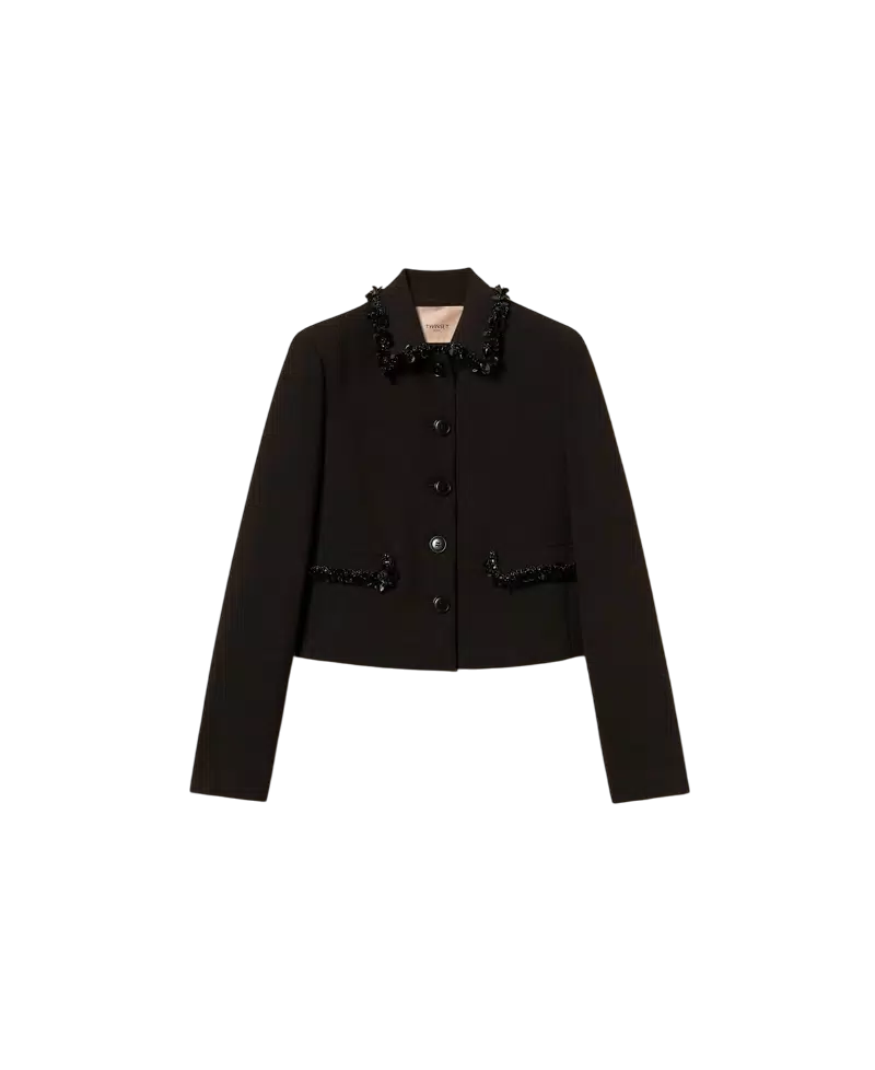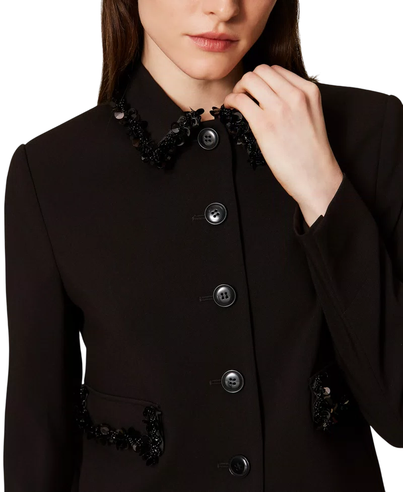 Giacca corta in crêpe di misto viscosa con colletto e tasche decorati da passamaneria di paillettes. Ha maniche lunghe con bottoni al fondo, chiusura con bottoni in tono, tasche con patta, fodera, placchetta logo Oval T sul retro, linea slim