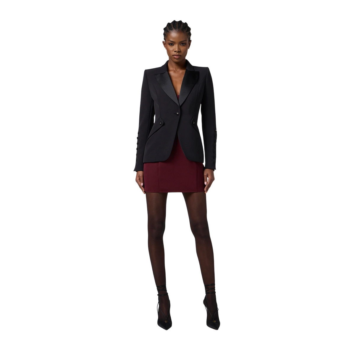 Giacca monopetto in crêpe leggero dalla vestibilità slim. Con richiami al tuxedo maschile, il blazer ha spalle strutturate, rever a lancia realizzati in raso e bottoni in tono. Le maniche presentano ampi spacchi con bottoni a pressione.