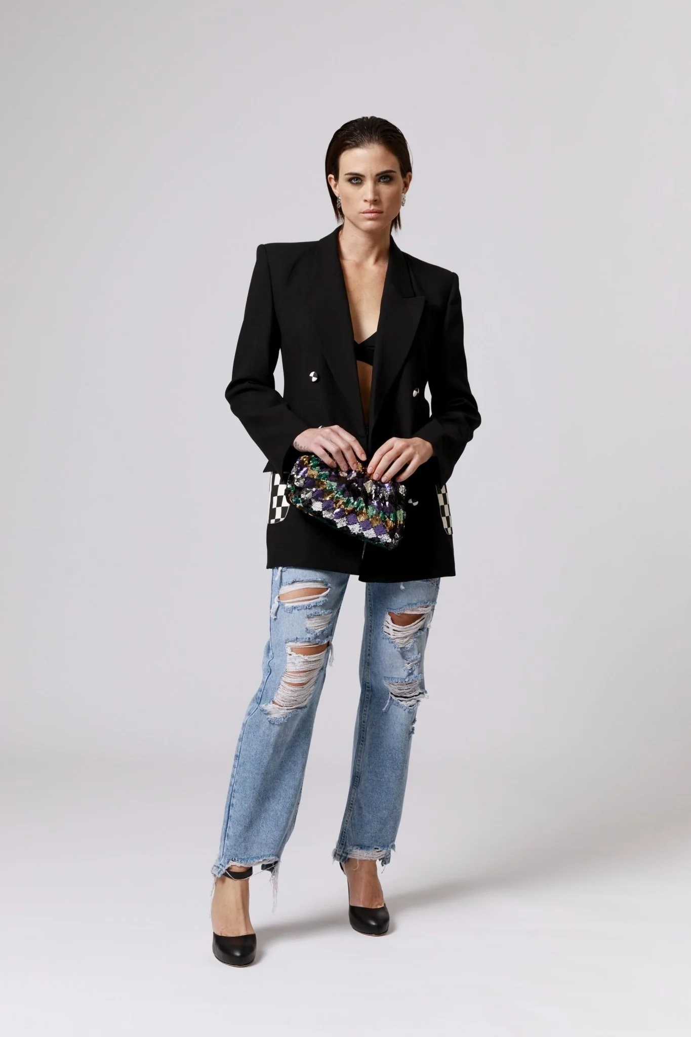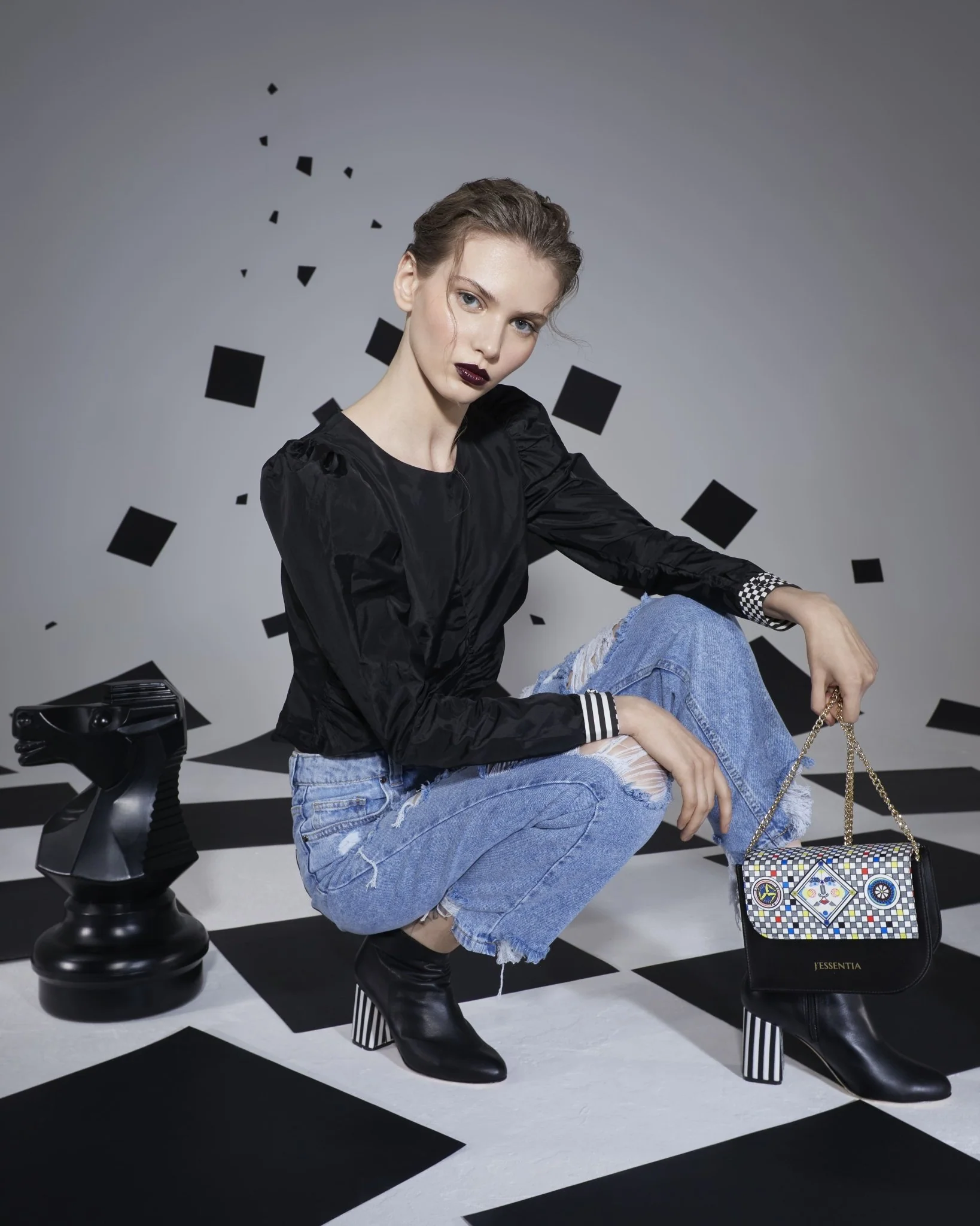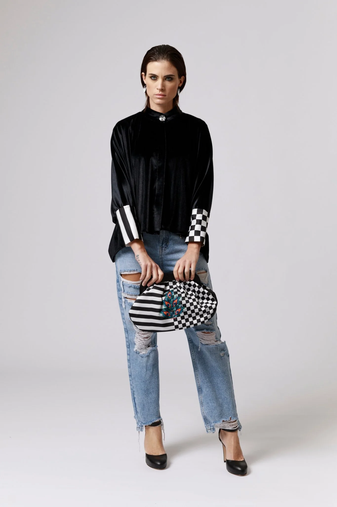 Jeans donna a vita alta con lunghezza alla caviglia che uniscono comfort e stile in un design audace e contemporaneo. Realizzati in 100% cotone, sono perfetti per chi cerca un capo versatile e di qualità. Il dettaglio strappato dona un look grintoso e moderno, ma ciò che rende i jeans davvero unici è la tasca posteriore in tessuto stampato, dipinta dall’artista Francesca Jennifer Puzzo.