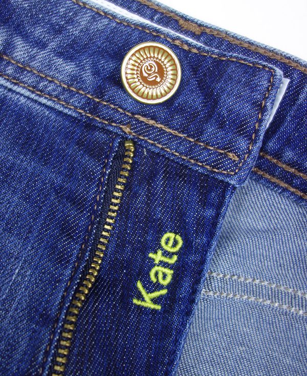 Jeans Kate straight fit a vita alta in misto cotone lyocell, modello a cinque tasche con logo ricamato sul taschino, passanti al punto vita, chiusura con bottone e zip coperta, patta interna ricamata con nome del pantalone e salpa in pelle con logo a rilievo.