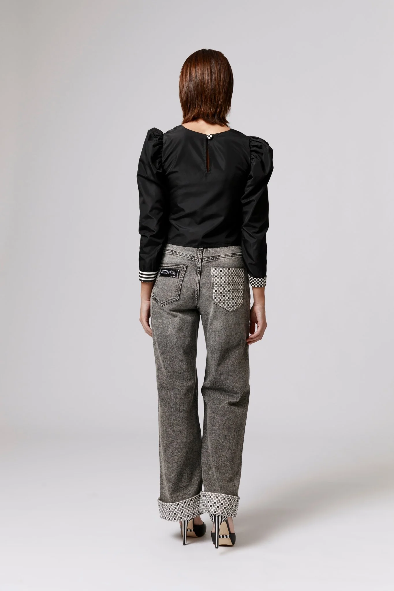 Jeans grigi a vita alta con svoltine d’arte a scacchi dipinte dall’artista Francesca Jennifer Puzzo, per uno stile audace e contemporaneo. Realizzati in 100% cotone, sono perfetti per chi cerca un capo versatile e di qualità.
