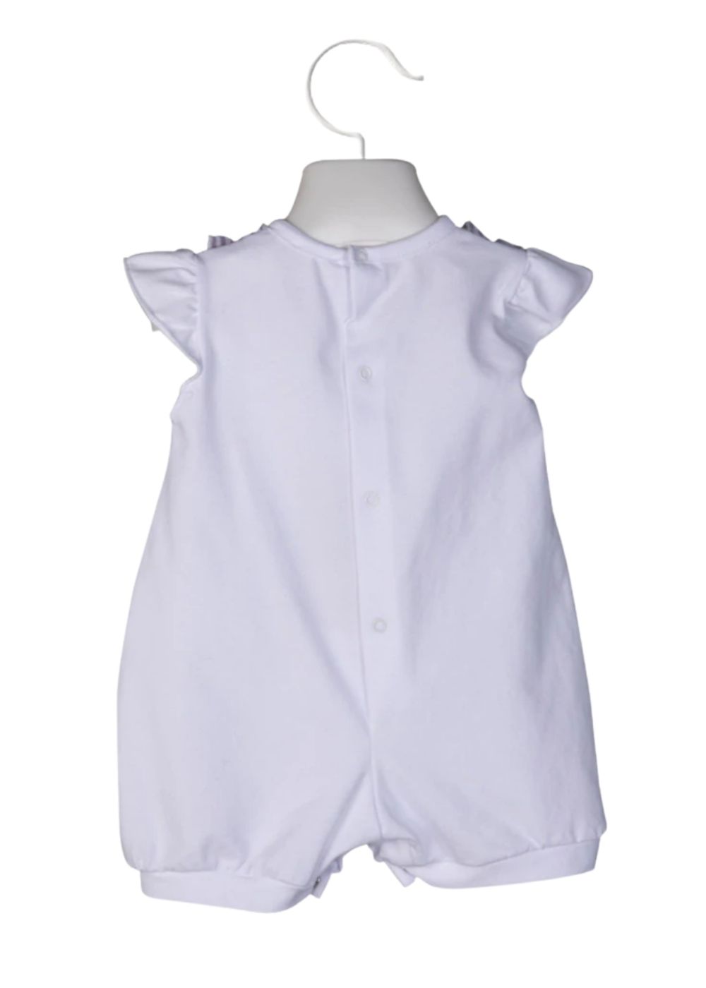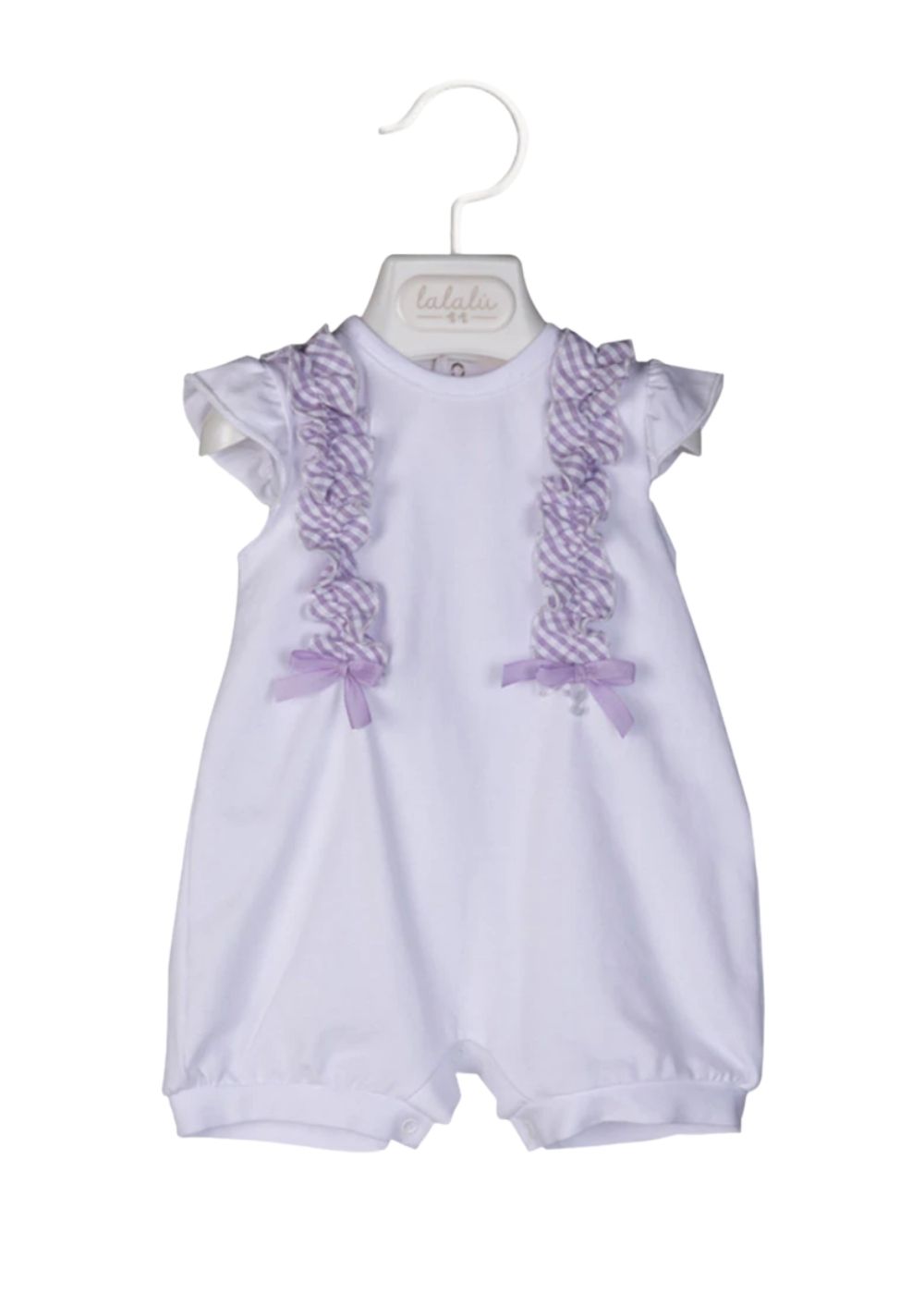 Adorabile pagliaccetto in jersey bielastico bianco impreziosito da due rouches in tessuto vichy fermate da due fiocchi. Immancabile il logo madreperla posizionato su uno dei due fiocchi. Abbottonatura inferiore e posteriore.