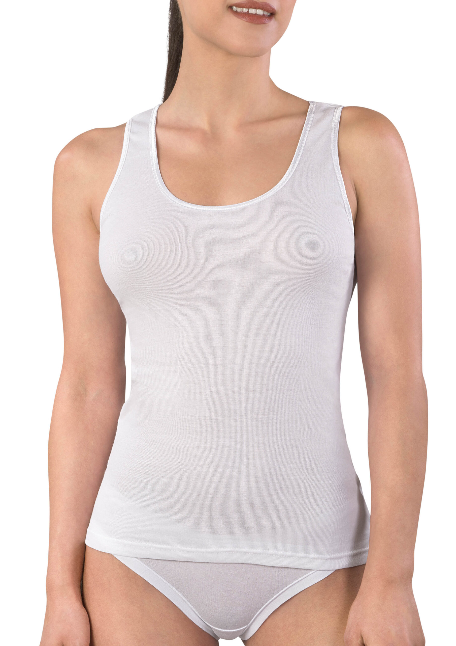 Canotta donna a spalla larga in costina 1/1 con raffinato bordo in raso. Perfetta combinazione di eleganza e comfort, ideale per ogni occasione. Disponibile in bianco e nero.