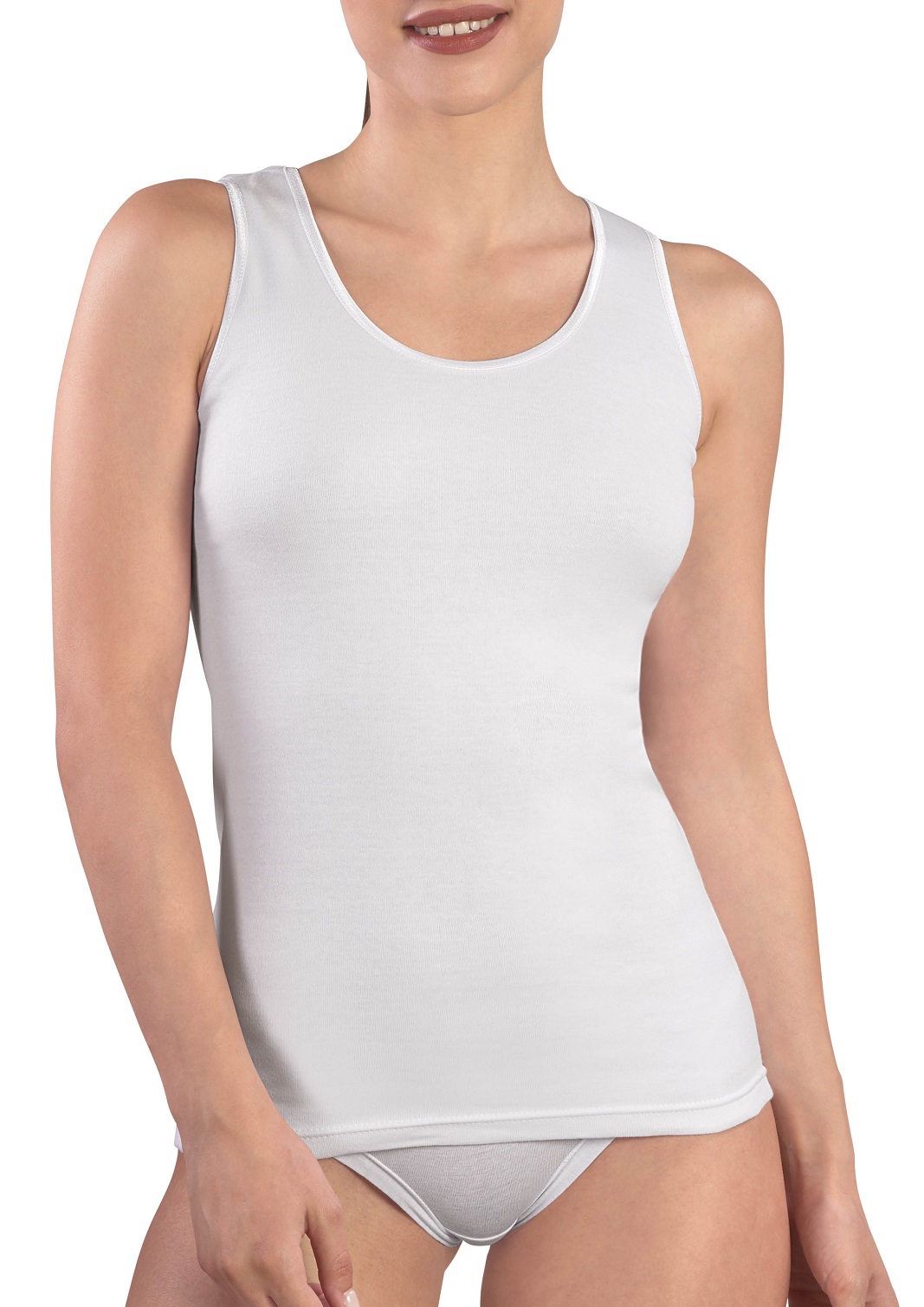 Questa canotta da donna è realizzata in tessuto interlock di caldo cotone, una lavorazione a doppio strato che garantisce resistenza e una piacevole sensazione di morbidezza sulla pelle. La canotta, disponibile in due colori classici – nero e bianco – è perfetta sia come capo intimo, da indossare sotto i vestiti, sia come top leggero per i momenti di relax. La struttura in interlock offre una superficie liscia e un comfort durevole, ideale per chi cerca qualità e praticità in un capo semplice ma essenziale.