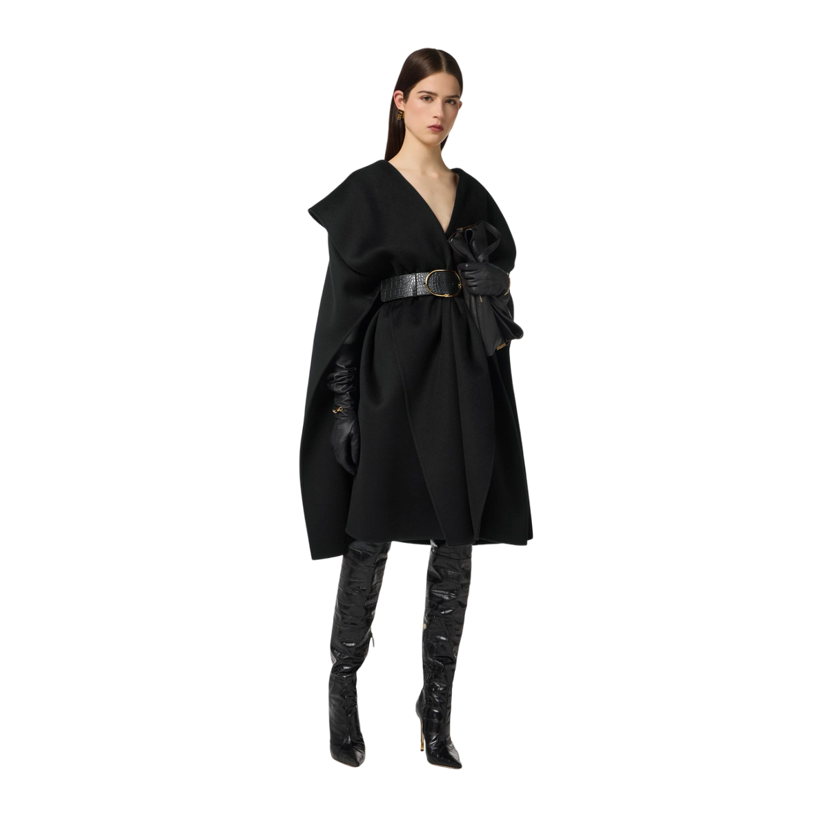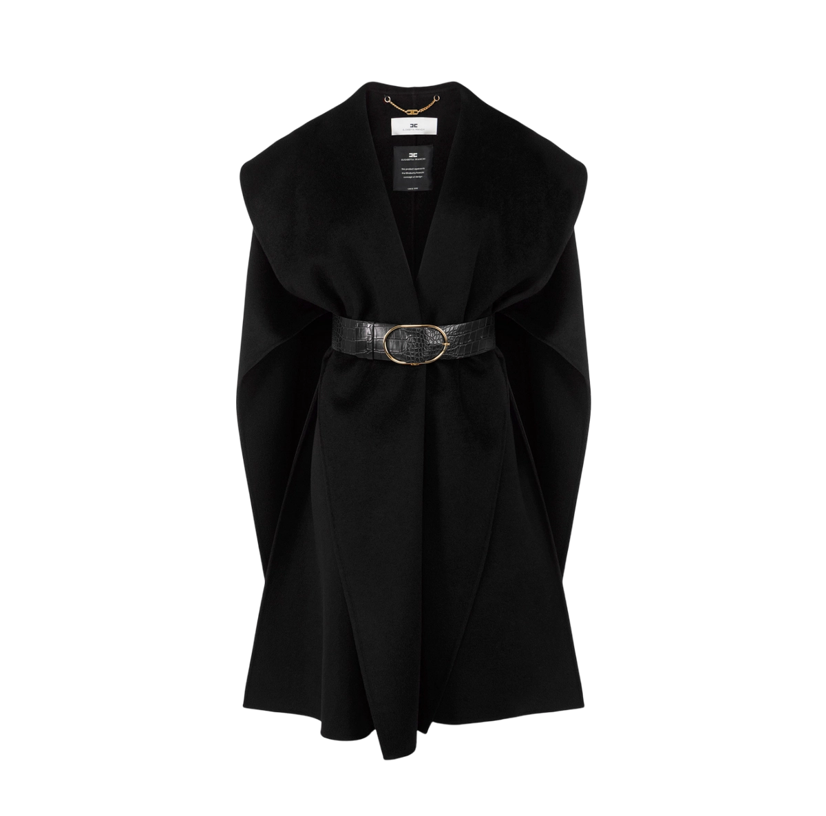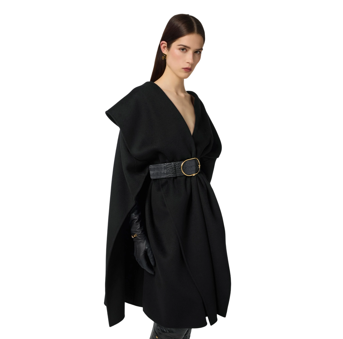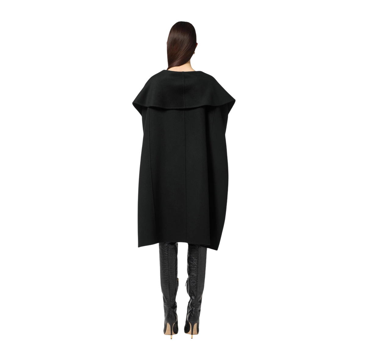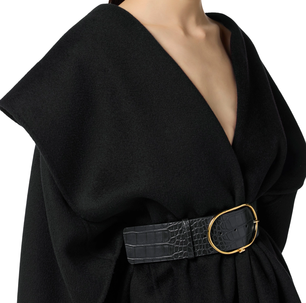 Mantella in panno di lana double sfoderata e dalla vestibilità over. I volumi avvolgenti sono definiti dalla cintura alta e in tono, con texture a stampa cocco che aggiunge carattere e completa di fibbia ad ardiglione con logo in metallo dorato.