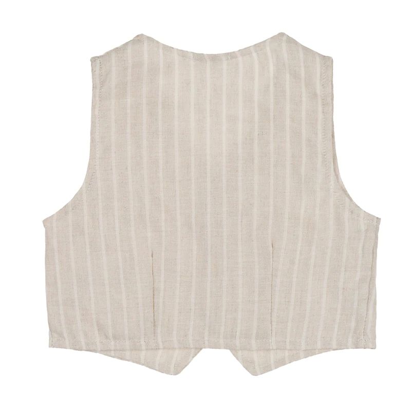 Delizioso gilet rigato, impreziosito dall’abbottonatura frontale. Il tessuto leggero in misto lino rende questo gilet adatto alle occasioni più importanti del tuo bimbo nelle sue prime giornate estive.