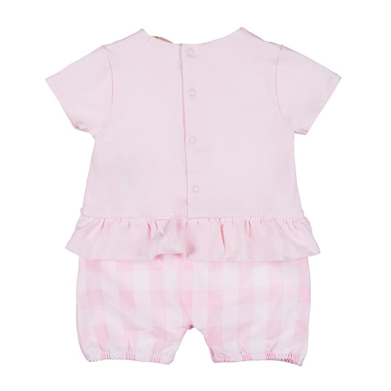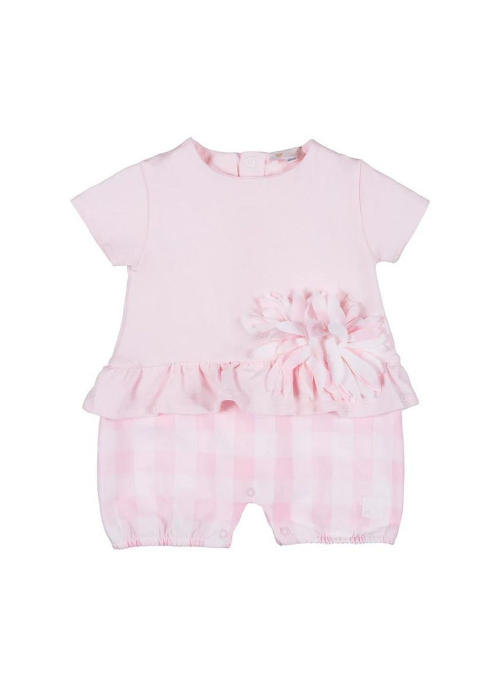 Delizioso pagliaccetto reso speciale dal tessuto a quadri nella parte inferiore. La dolce balza ed i due fiorellini applicati in tinta lo rendono davvero grazioso. Abbottonatura posteriore ed inferiore.