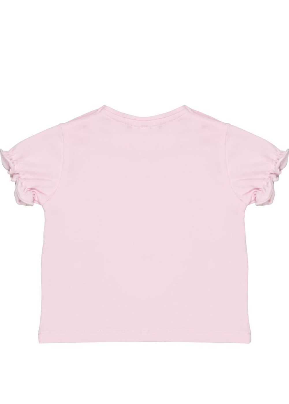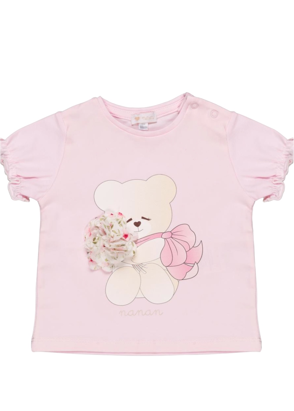 Graziosa t-shirt rosa della collezione “Pretty Baby”, impreziosita da dolce orsetto applicato sul fronte con un tenero bouquet di fiori in organza e arricciatura sul fondo delle maniche. Abbottonatura superiore all’altezza del colletto per facilitarne l’indosso.