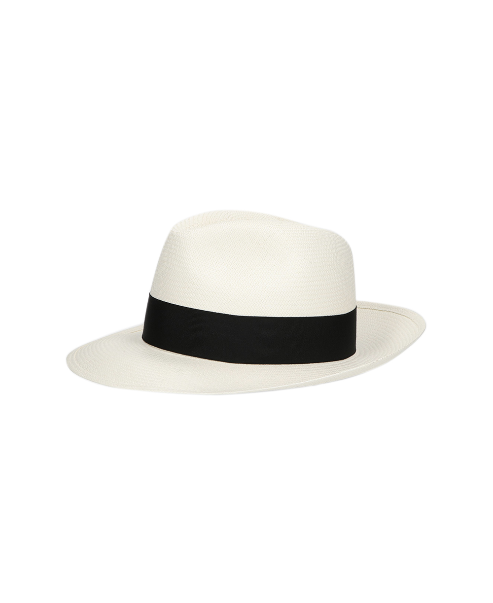 Cappello classico in panama extra-fine, sfoderato, tesa larga (7,5cm), cinta con fiocco in gros grain a contrasto con logo (4cm).