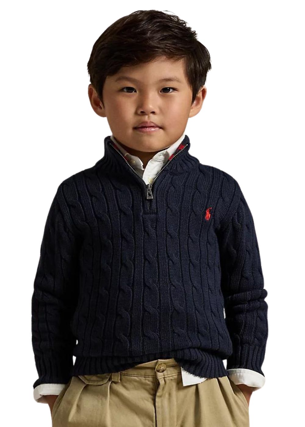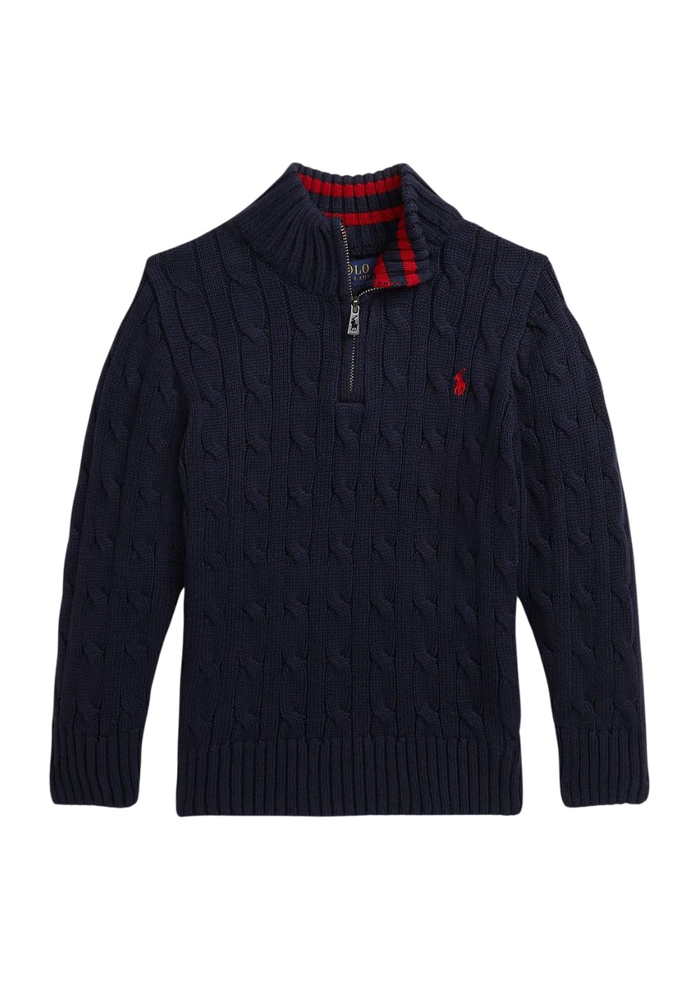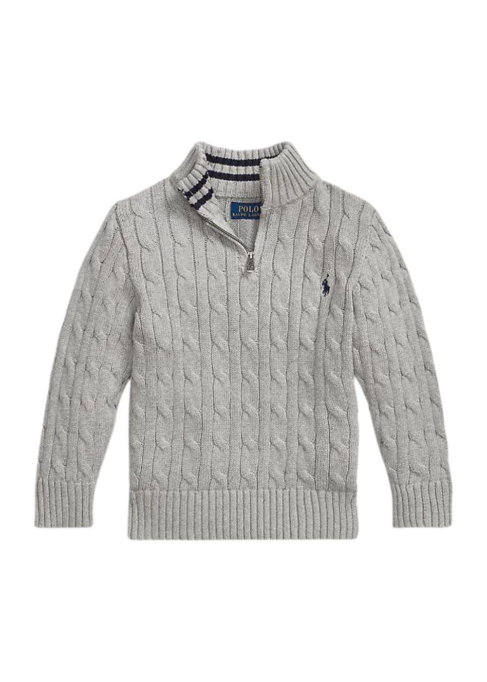 - Collo a lupetto con lavorazione a coste e risvolto a righe. Chiusura con un quarto di cerniera.