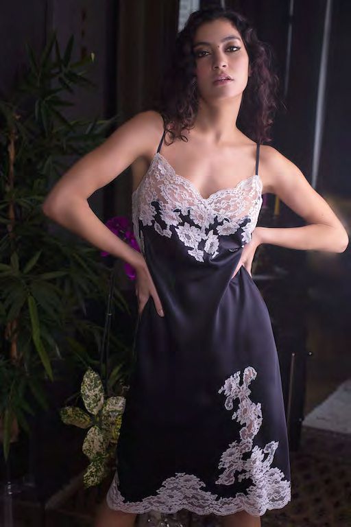 SOTTOVESTE NERA CON PIZZO AVORIO APPLICATO NELLA PARTE SUPERIORE E AL FONDO. MODELLO PIU’ LUNGO RISPETTO ALLE ALTRE SOTTOVESTI QUESTO CI PERMETTE DI USARLO COME ABITO CON UN BEL MAGLIONCINO DI LANA O CARDIGAN DA ABBINARE INSIEME. LE TAGLIE SONO GIA’ QUELLE ITALIANE.