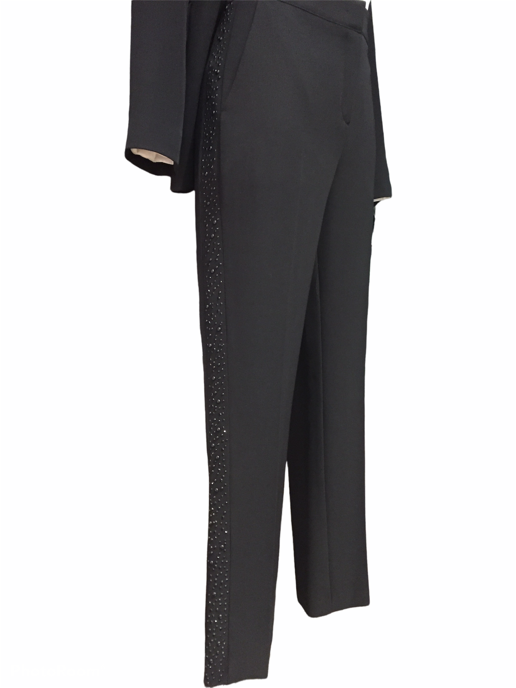 TAILLEUR COMPOSTO DA GIACCA SMOKING CON REVERS TEMPESTATO DI STASS TONO SU TONO, DUE TASCHE APRIBILI COPERTE DA PATTINA.